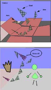 This process of developing an animated character focuses on maximizing the advantages of CAVE VR, the immersion into an interactive 3-D world, while minimizing the disadvantages, like the relative simplicity of the images. It was immediately obvious that any degree of photo-realism, and even the visual complexity of most computer animation, was impossible. This resulted in a decision to make a very clean, uncomplicated environment, and to create a virtual character who is simply a collection of pyramids. Capturing the motion for the Thing's head and limbs is the most efficient and effective way of giving this collection a life.